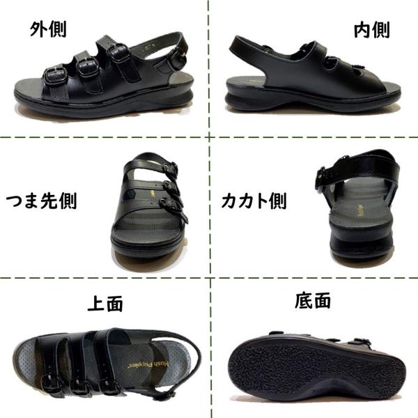 定番でリピーターの方が多いこちらのサンダルは、前足部の3本のベルトで幅の広さや甲の高さを自在に調整できるので、様々な足の方にフィットしやすく、内反小趾や外反母趾の方にもオススメしやすいサンダルです。また、中敷きの下には3mmのシートクッションを敷いているので、底あたりも柔らかく地面の衝撃を和らげてくれます。