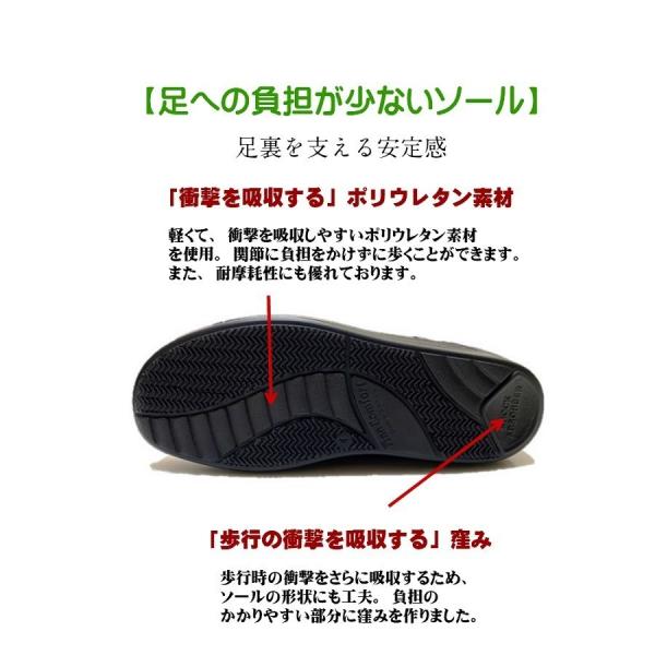足裏を支えるインソール(スーパーコンフォートアインラーゲン)は、縦のアーチ(土踏まずと外踏まず)と横のアーチにフィットする立体形状で、足の動きと姿勢を自然に安定させ、前スベリせずに地面を踏みしめやすくします。また、こちらの2953にはクッション性のある低反発素材をプラスしておりますので、地面の衝撃も和らげます。