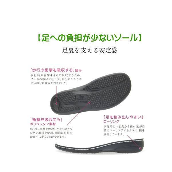 足裏を支えるインソール(スーパーコンフォートアインラーゲン)は、縦のアーチ(土踏まずと外踏まず)と横のアーチにフィットする立体形状で、足の動きと姿勢を自然に安定させ、前スベリせずに地面を踏みしめやすくします。