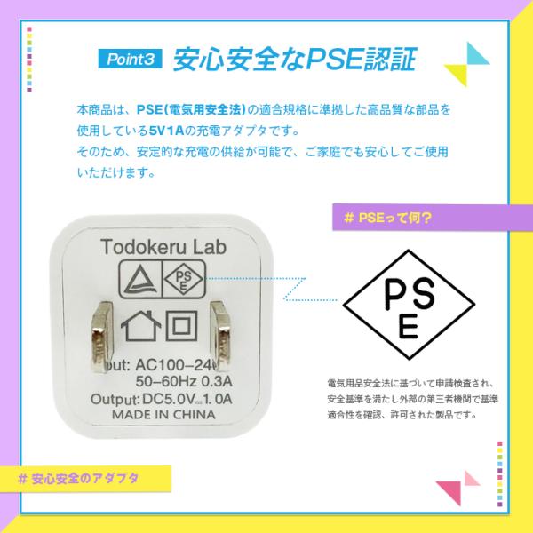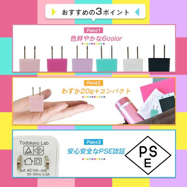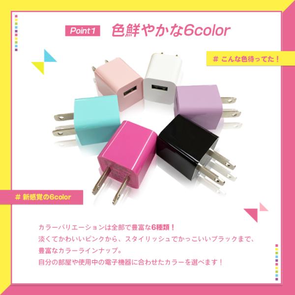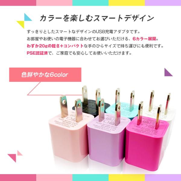 USB充電アダプター 充電器「カラフル 全6色 & 安心のPSE認証済み」5V 1A 1口/1ポートタイプ ACアダプタ
