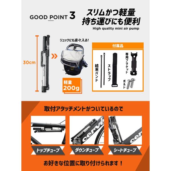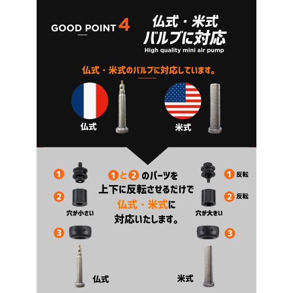 ・対応バルブ:米式(Schrader)、仏式(Presta) ・材質:アルミ、樹脂