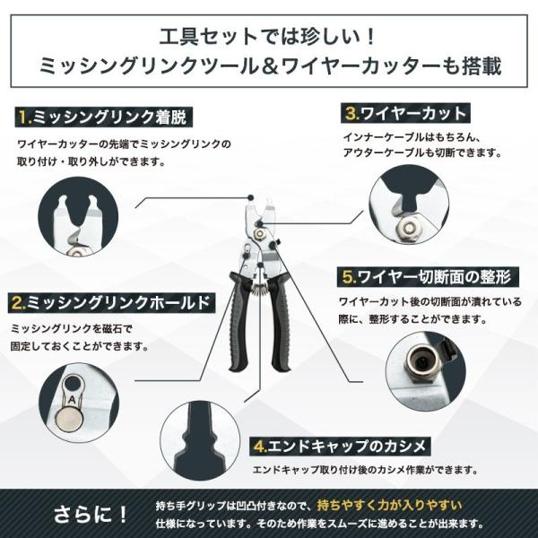 【ミッシングリンクツール&ワイヤーカッターも搭載!】ミッシングツール一体型のワイヤーカッターを搭載しています。これ一つで5つの用途に使用できます。(1)ミッシングリンク着脱(2)ミッシングリンクホールド(3)ワイヤーカット(4)エンドキャップのカシメ(5)ワイヤー切断面の整形