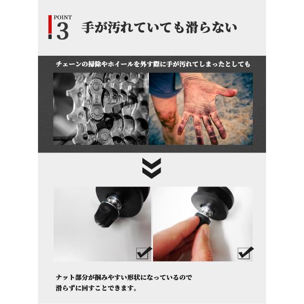 ・チェーンの掃除やホイールを外す際に手が汚れても、ナット部分は指がはまるような形状になっているので滑らずにつまむことが出来ます。