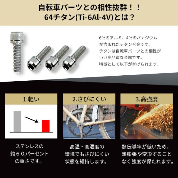 材質:64チタン(Ti-6Al-4V) 本体サイズ:ボルト:M5×18mm 重量:1個約2.2g
