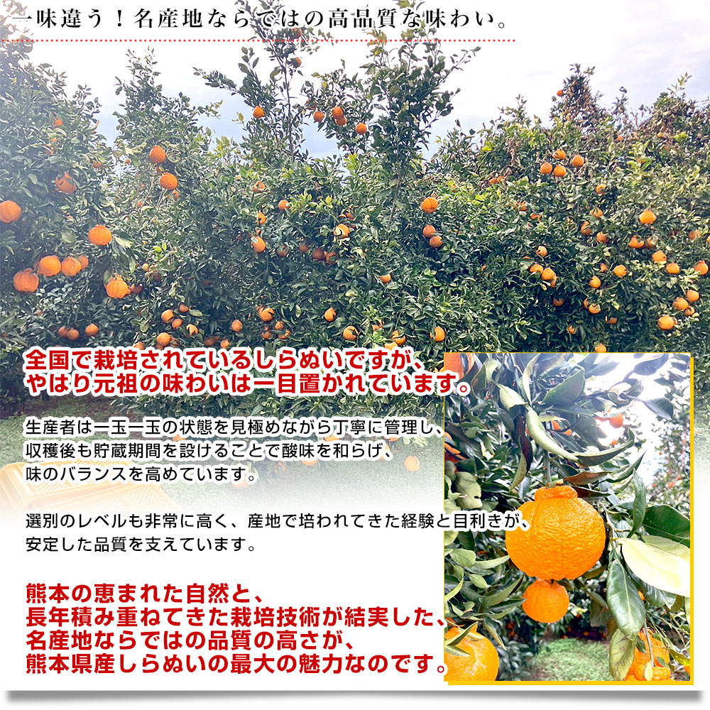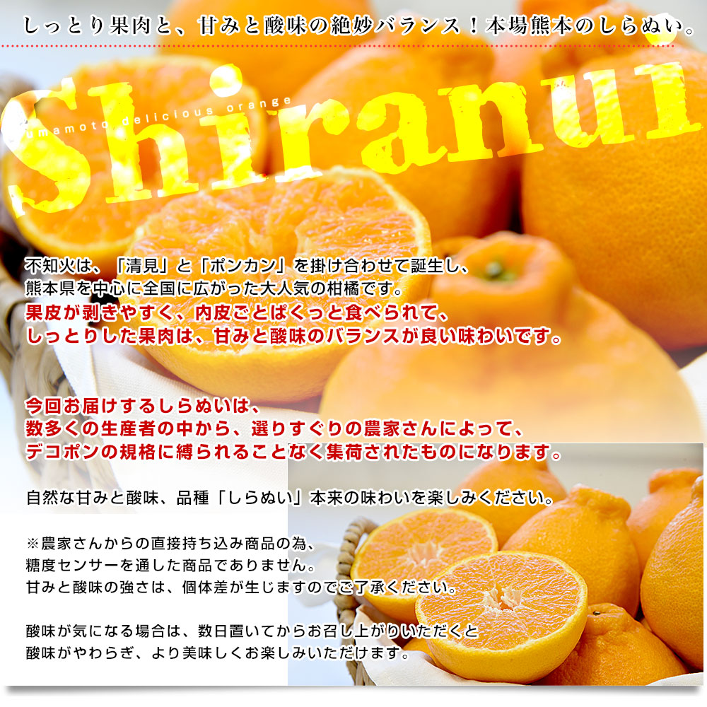本場熊本から産地直送!極旨のしらぬいをお届けします。しっとりとした果肉で、甘みと酸味のバランスの良い味わいです。やはり元祖は違う!と言われる、名産地ならではの高品質なしらぬいを、是非お楽しみください。