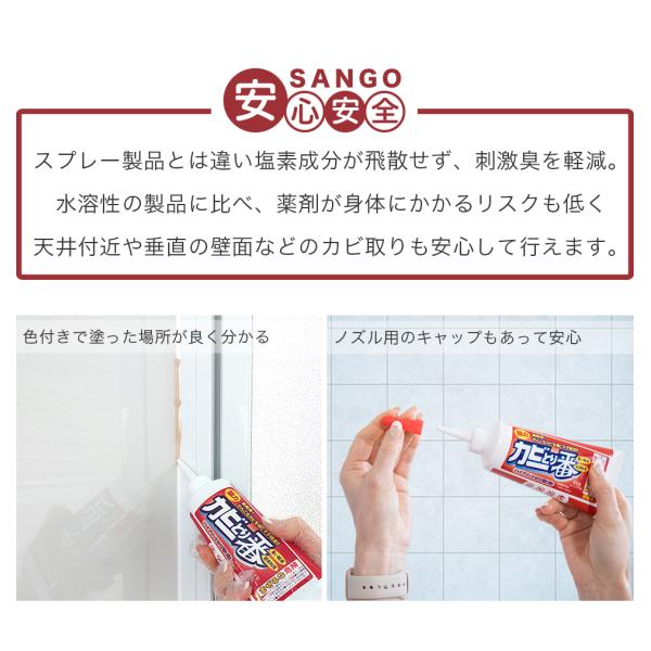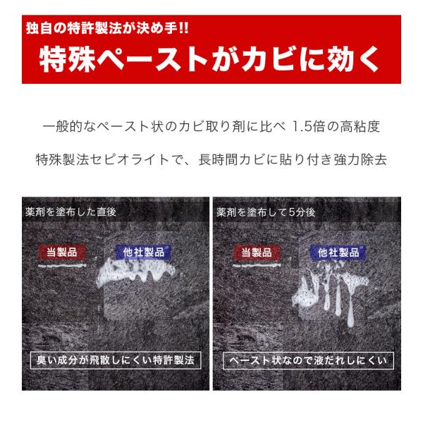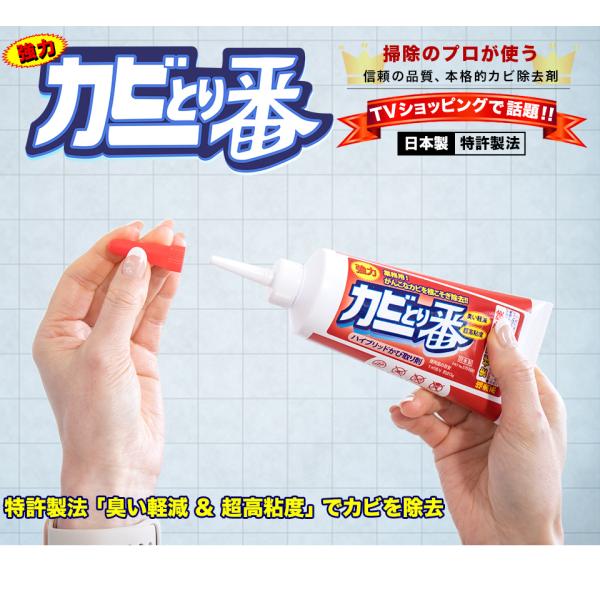 カビキラー等のスプレータイプとは異なるペースト状の薬剤で、塩素成分の飛散防止、刺激臭を軽減した特許製法の日本製。かびとりいっぱつ(カビとり一発)は、当製品とは別の商品です。類似品にご注意ください。