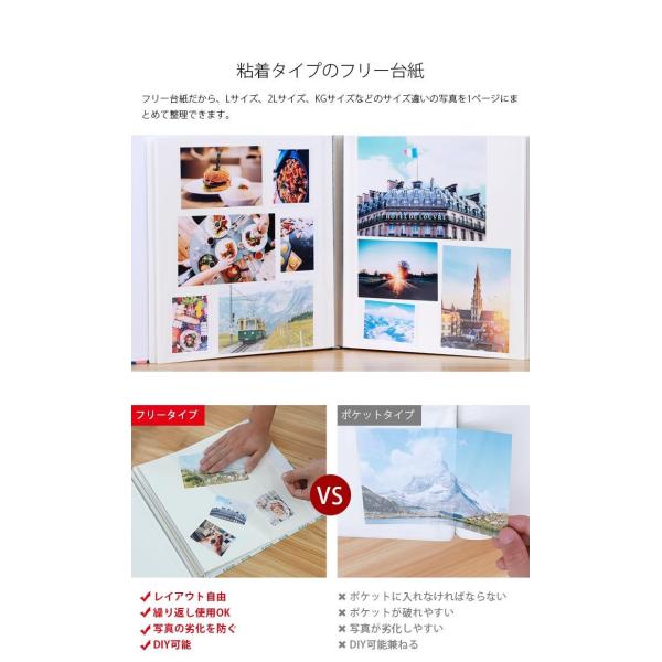 ☆フリー台紙だから、Lサイズ、2Lサイズ、KGサイズなどのサイズ違いの写真を1ページにまとめて整理できます。グリッドなし、自由に写真を貼ります。