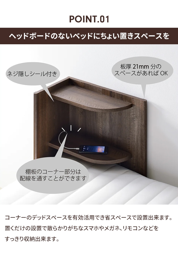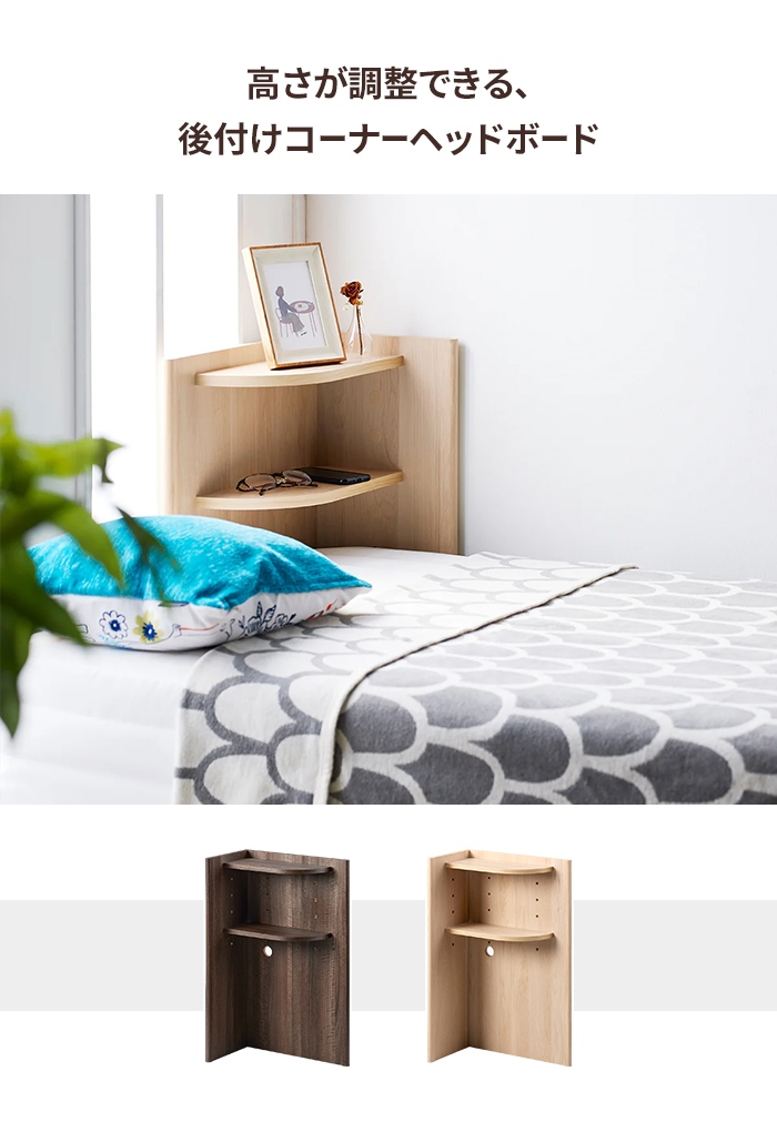 ヘッドボード 後付け コーナータイプ 木製 棚 コード穴付き 隙間収納 スリム コンパクト サイドテーブル 小物置き 宮棚 ベッド収納 収納ラック ベッドサイド