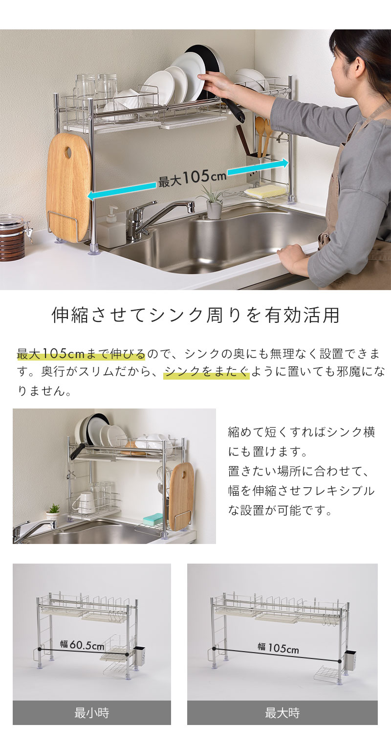 水切りかご シンク上 幅60-105 奥行21 高さ46.5cm 伸縮