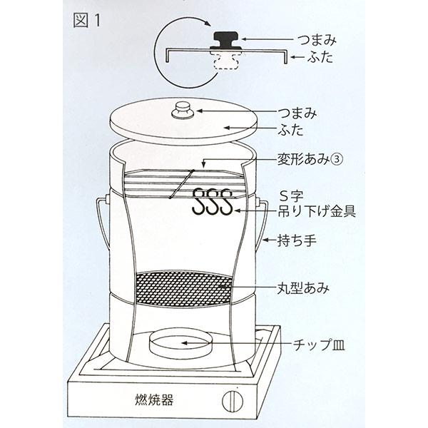 材質:本体・蓋/ガルバニウム鋼板、持ち手/亜鉛鉄線、つまみ/ペークライト、チップ皿/亜鉛鉄板、丸型網/亜鉛鉄線、変形網/鉄線