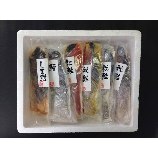 秋鮭甘味噌漬切身80g×1、秋鮭粕漬切身80g×1、秋鮭西京漬切身80g×1、真鱈粕漬切身80g×1、しまほっけ甘味噌漬切身80g×1、紅鮭西京漬切身80g×1