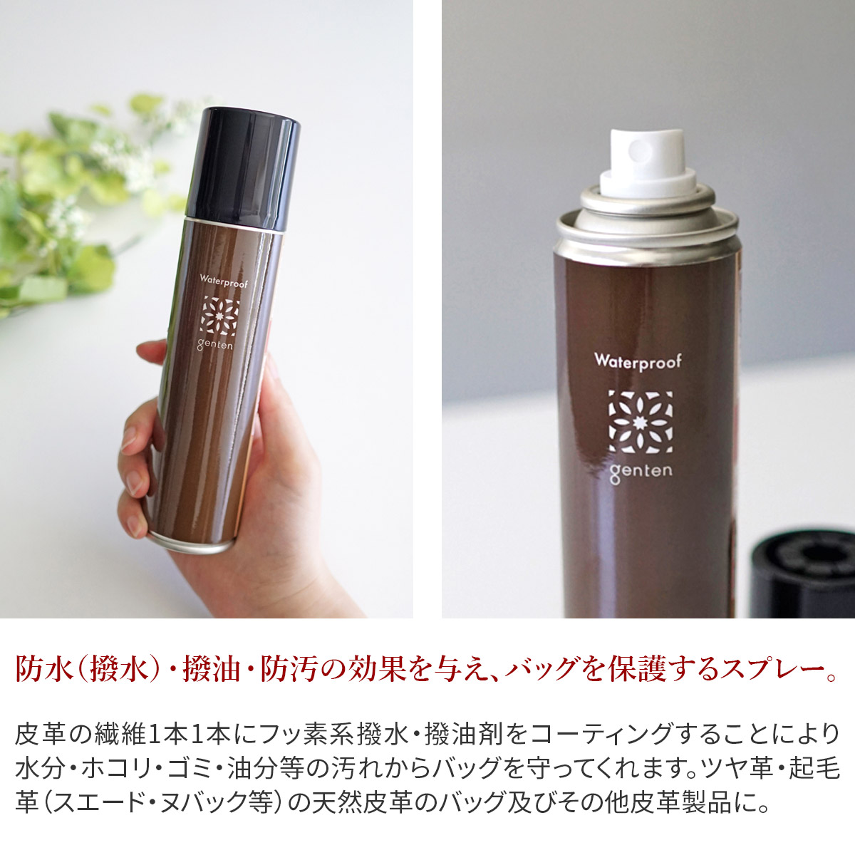 ・防水(撥水)・撥油・防汚の効果を与え、バッグを保護するスプレーです。