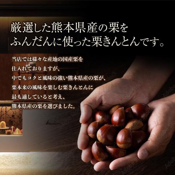 厳選した熊本県産の栗を使用した栗きんとんです。 職人が一つ一つ手作りで仕上げています。 栗本来の風味を活かした、シンプルな味わいが特長です。 岐阜県中津川の伝統的な栗きんとんをベースに、独自の製法で仕上げました。 粗ごしした栗きんとんの上に、なめらかなマロンペーストを重ね、異なる食感を楽しめるようにしています。 見た目にも配慮し、栗の風味とやさしい甘さを感じられる仕上がりです。 素材の味を活かした栗きんとんをお楽しみください。