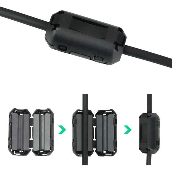 ・パソコン、USB、マウス、キーボード、ドライブレコーダーなどの周辺で使用されているケーブルに設置するだけで、フェライトコアの高周波吸収特性が効いて高周波ノイズが除去されます。