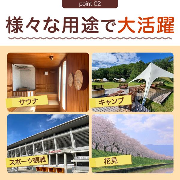 ・快適クッション: お尻が痛くならない特殊な溝加工デザインで、長時間のサウナでも快適に過ごせる