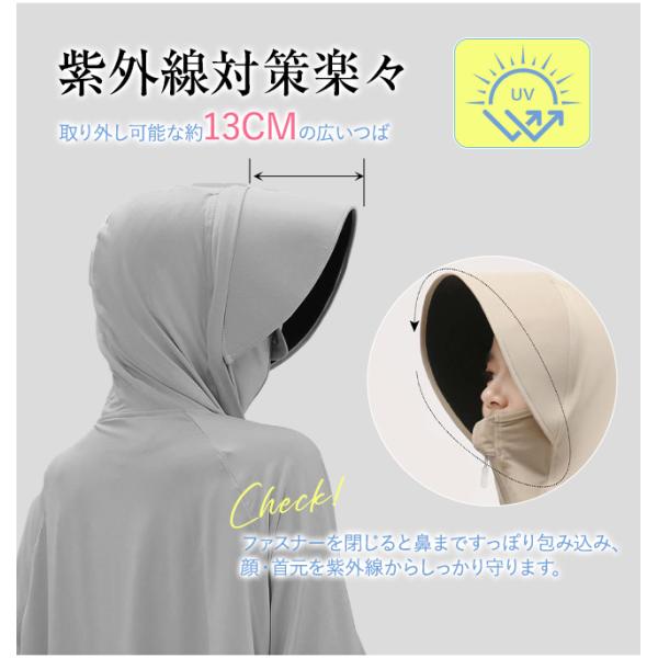 ファスナーを閉じると鼻まですっぽり包み込み、顔・首元を紫外線からしっかり守ります。