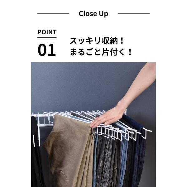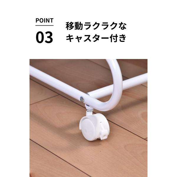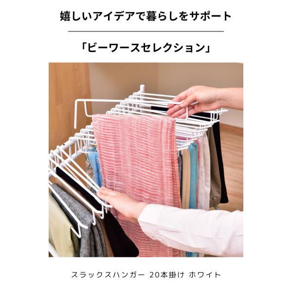 ビーワーススタイルの【スラックスハンガー 20本掛け ホワイト】は、20本のスラックスをしっかりと掛けられる大容量ハンガーです。スイング式で左右に開閉し、隣のスラックスが邪魔にならない設計。キャスター付きなので移動もラクラク。シワがつきにくく、綺麗に収納できるため、クローゼットや洗面所、キッチンなど様々なシーンで活躍します。耐荷重1kgでジーンズやネクタイ、ベビー服など多用途に対応。丈夫なスチール製で長くご愛用いただけます。