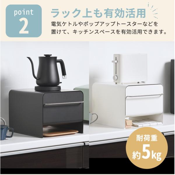 ラックの上にはポップアートトースターや電気ケトル等を置けて、スペースを有効活用