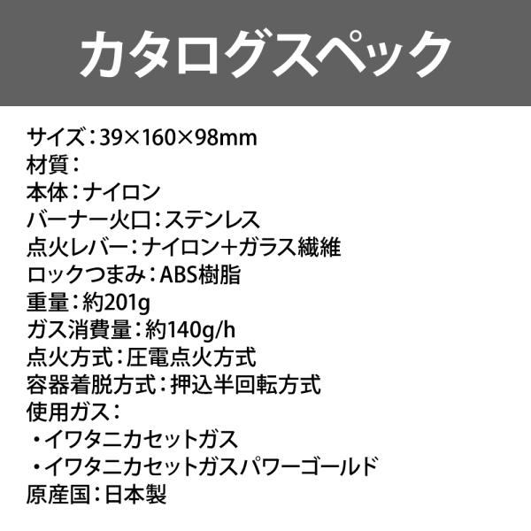 ■材質:[本体] ナイロン、[バーナー火口] ステンレス、[点火レバー] ナイロン+ガラス繊維、[ロックつまみ] ABS樹脂