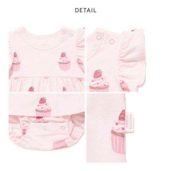 カップケーキとブランドロゴを総柄プリントして、袖にフリルをあしらったドレス風のBABYロンパース。