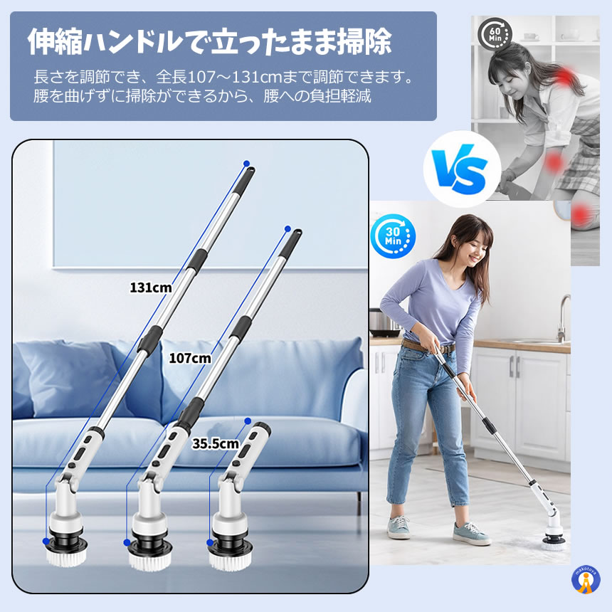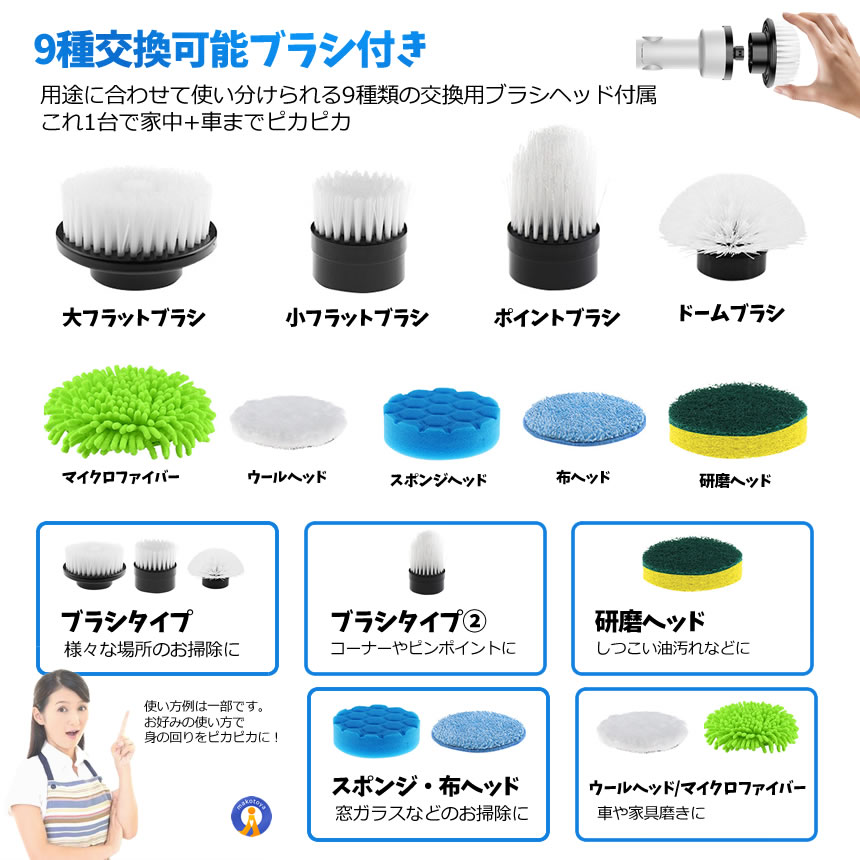 電動ブラシ 掃除 コードレス 180°回転 9種交換ヘッド付き 電動クリーニング ブラシ 充電式 180BURASHI