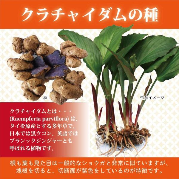 クラチャイダムとは(Kaempferia parviflora)は、タイを原産とする多年草で、日本では黒ウコン、英語ではブランックジンジャーとも呼ばれる植物です。根も葉も見た目は一般的なショウガと非常に似ていますが、塊根を切ると、切断面が紫色をしているのが特徴です。