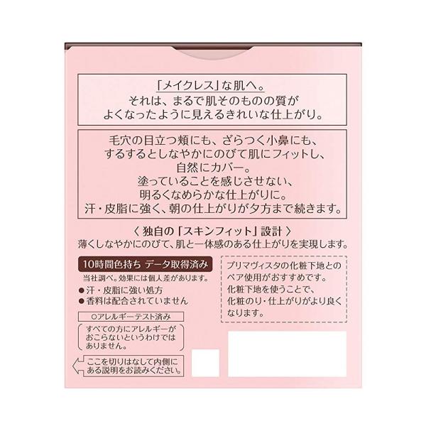 「商品情報」毛穴やくすみを自然にカバーして、まるで肌の質がよくなったようなきれいな仕上がり。毛穴の目立つ頬にも、ざらつく小鼻にも、しなやかにのびて、ぴたっと密着し、自然にカバー。塗っていることを感じさせない、明るくなめらかな仕上がりに。汗・皮脂にも強く、朝の仕上がりが夕方まで続きます。独自の「スキンフィット」設計。薄くしなやかにのびて、肌と一体感のある仕上がりを実現します。汗・皮脂に強い処方SPF25・PA++。香料は配合されていません。専用スポンジ付き「主な仕様」SPF25 PA++