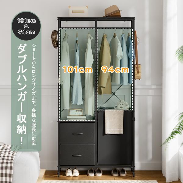 ハンガーラック ランドリーバスケット付き おしゃれ クローゼット 収納付き 洋服収納 引き出し付き キャスター付き 洋服ラック ランドリー収納 棚付き 爆買