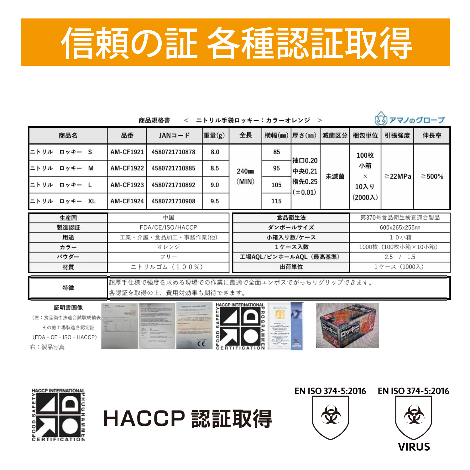 【送料無料】アマノグローブ 4個セット 400枚 ロッキー ニトリル手袋 S M L XL 超厚手・耐油・耐摩耗 フィット感 耐油・滑り止め加工 パウダーフリー 使い捨て