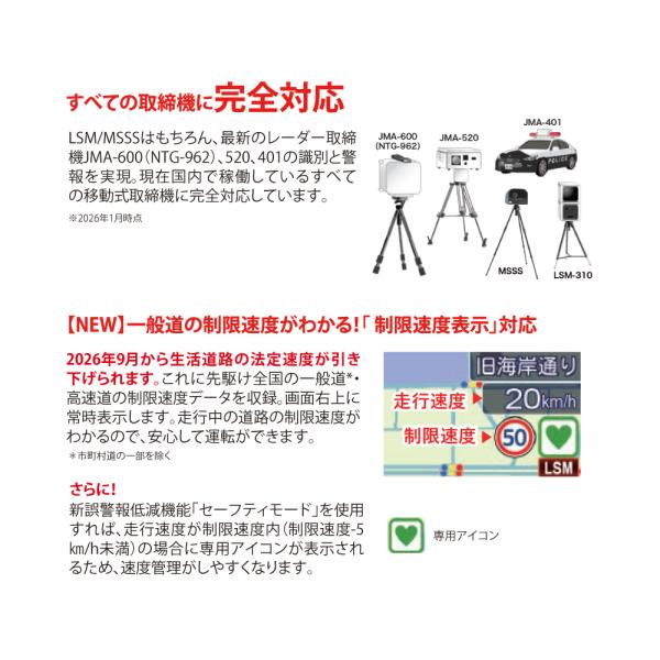 さらに、2026年9月の生活道路 法定速度引き下げに先駆け、全国の一般道の制限速度表示に対応。業界最大級4.0インチIPS液晶採用。