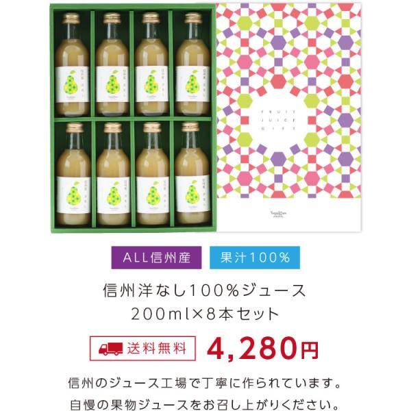 洋なしジュース ジュースギフト 果汁100%ジュース 200ml 8本 洋梨ジュース 保存料不使用 国産 お中元 内祝 出産内祝い 送料無料 爆買