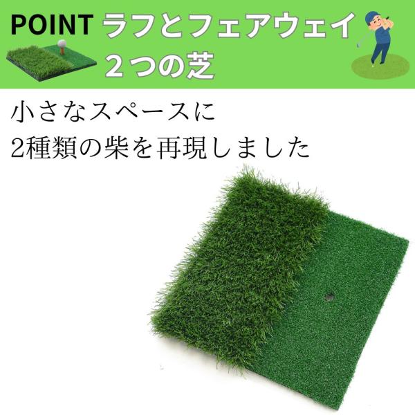 2WAY機能: 一つのマットでフェアウェイとラフの両方のショット練習が可能。リアルな芝の高さを再現し、コースでの実践に近い感覚で練習できます。