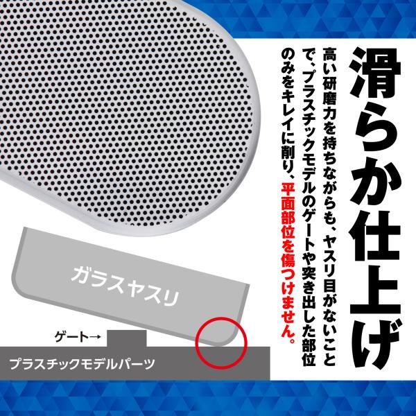 【作業効率アップ】 特殊な超微細粒子構造で金属ヤスリ並みの高い研磨力を持ち、短時間で効率的に処理が行えます。ヤスリ目が無いので全方位に動かすことが出来、ゲートや突き出した部分のみを削ることが可能なため、パーツの平面部位が傷つきません。