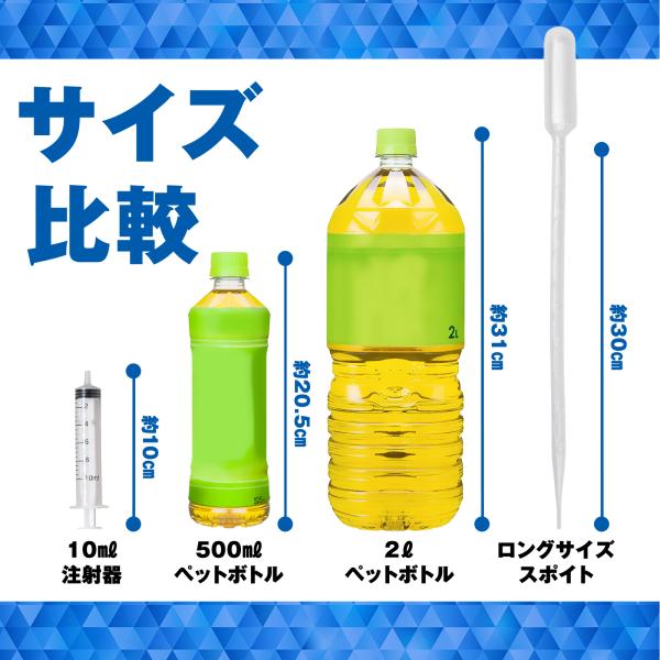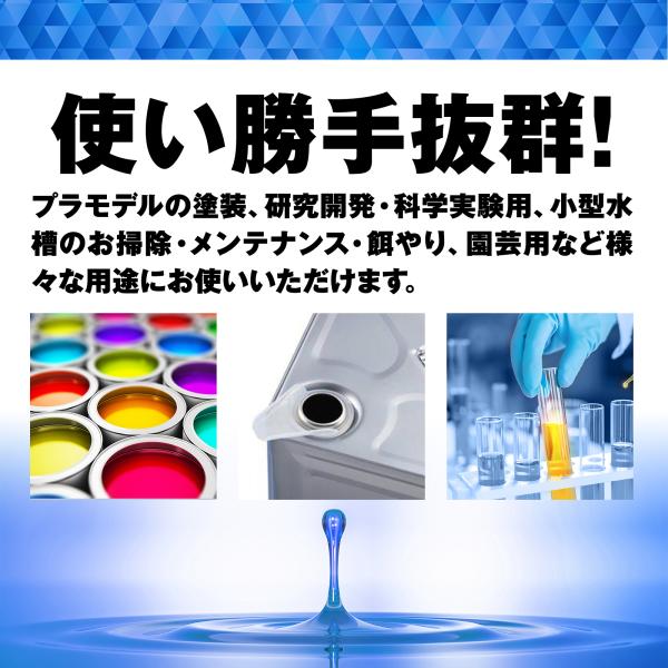 うすめ液の容器が大きいと、溶剤を抜き取るときに誤って容器の中にスポイトが落ちてしまうことも。<BR>【観賞魚の飼育に】<BR>赤虫などの餌やりや、水槽内に沈殿したごみや残餌の除去、金魚鉢程度の小さい水槽なら水換えもOK!<BR>【園芸・ガーデニング用に】<BR>面倒な液体肥料の希釈が楽ラクに!ボトルのキャップで計量してこぼれたり、手に付かないよう気を遣う心配もありません。<BR>【その他にも様々な用途に】<BR>自分次第で使い道は色々♪すぐに使えるよう予めストックしておくと便利です。<BR>●研究開発職<BR>●大学や高校の授業、研究室・ゼミ、科学部などでの実験用に<BR>●化粧水やシャンプーなどコスメの小分けボトルへの移し替えetc