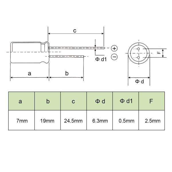 ボディサイズ:6.3 x 7mm(D * L) ;リード長さ:24.5mm 、19mm ;リードピッチ:2.5mm