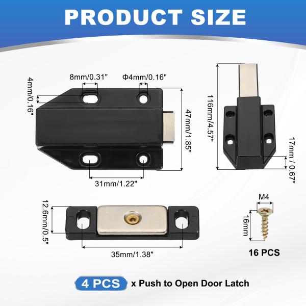 サイズ:116×47×17mm / 4.57×1.85×0.67インチ(長さ×幅×厚さ); 丸穴径:4mm / 0.16インチ; 楕円穴径:8×4mm / 0.31×0.16インチ; 横穴間隔:35mm / 1.38インチ; 上下穴間隔:31mm / 1.22インチ; ネジサイズ:M4×16mm(径×長さ); 鉄板サイズ:46×12.6mm / 1.81×0.5インチ; 同梱内容:プッシュドアラッチ×4個