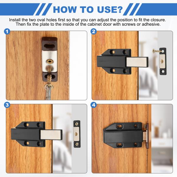 取扱説明:最初に2つの楕円穴を取り付けて位置を調整し、クロージャーに適合させます。次にプレートを戸棚ドアの内側にネジまたはせっちゃくざいで固定します。これ
