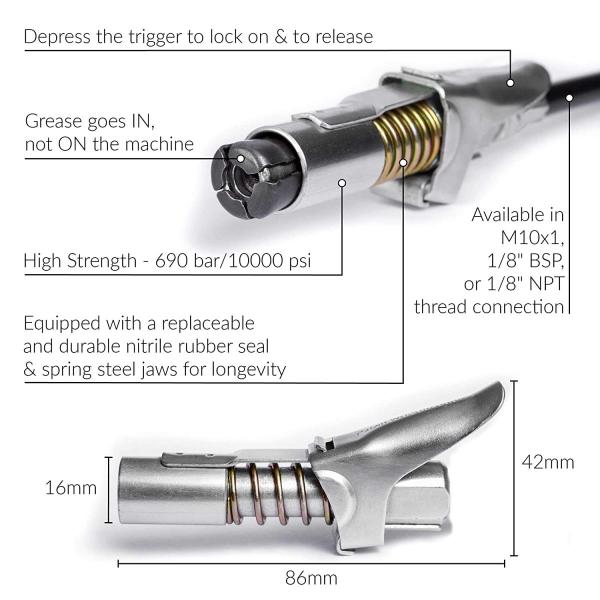 グリスニップルの 「キャッチ」「リリース」を簡単に行えるロックオンレバー付きのチャッキング。確実に接続ができグリスアップ時間の節約、グリスの節約にも貢献します。