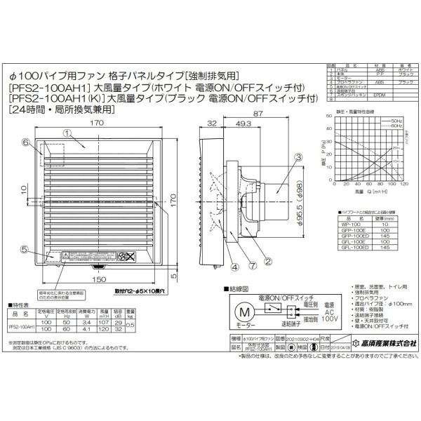 高須 換気扇 パイプファン 大風量タイプ 100φ PFS2-100AH1(K) スイッチ付 トイレ用 洗面所 パイプ用換気扇 パイプ用ファン ブラック 黒