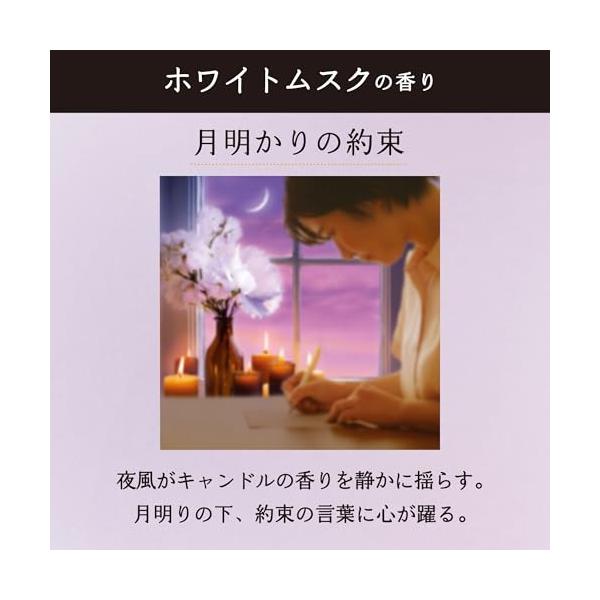 柔軟剤の香りで心ときめくシーンを再現。「月明りの約束」:夜風がキャンドルの香りを静かに揺らす。月明りの下、他愛もない約束の言葉に心が躍る。ホワイトムスクのほのかな甘さが染みわたる。