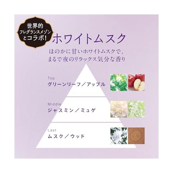 「ホワイトムスク」ほのかに甘いホワイトムスクで、まるで夜のリラックス気分な香り:トップ:グリーンリーフ・アップル/ミドル:ジャスミン・ミュゲ/ラスト:ムスク・ウッド。