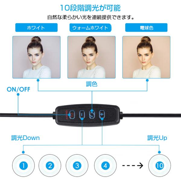 3色照明モードが付属して(ホワイト、ウォームホワイト、電球色)10段階の光量調整の機能が付いています。