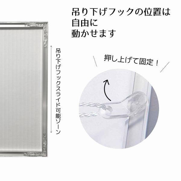 ポスターの出し入れが簡単な利便性を重視した、ネジ不要のワンロック方式。吊下げ金具の位置を自由に変更可能です。