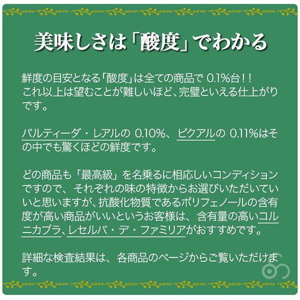 オリーブの命ともいえる酸度が0.1という、エキストラヴァージンオイルの規定である「酸度0.8以下」を圧倒的に超える最良鮮度を誇ります。(酸度は低ければ低いほど、鮮度が高い良品です)