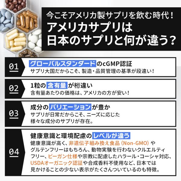 ※小麦、グルテン、大豆、牛乳、卵、魚、甲殻類、ナッツ類、ゴマは含まれていませんが、これらのアレルゲンが含まれている他の成分を処理するGMP工場で生産されています。