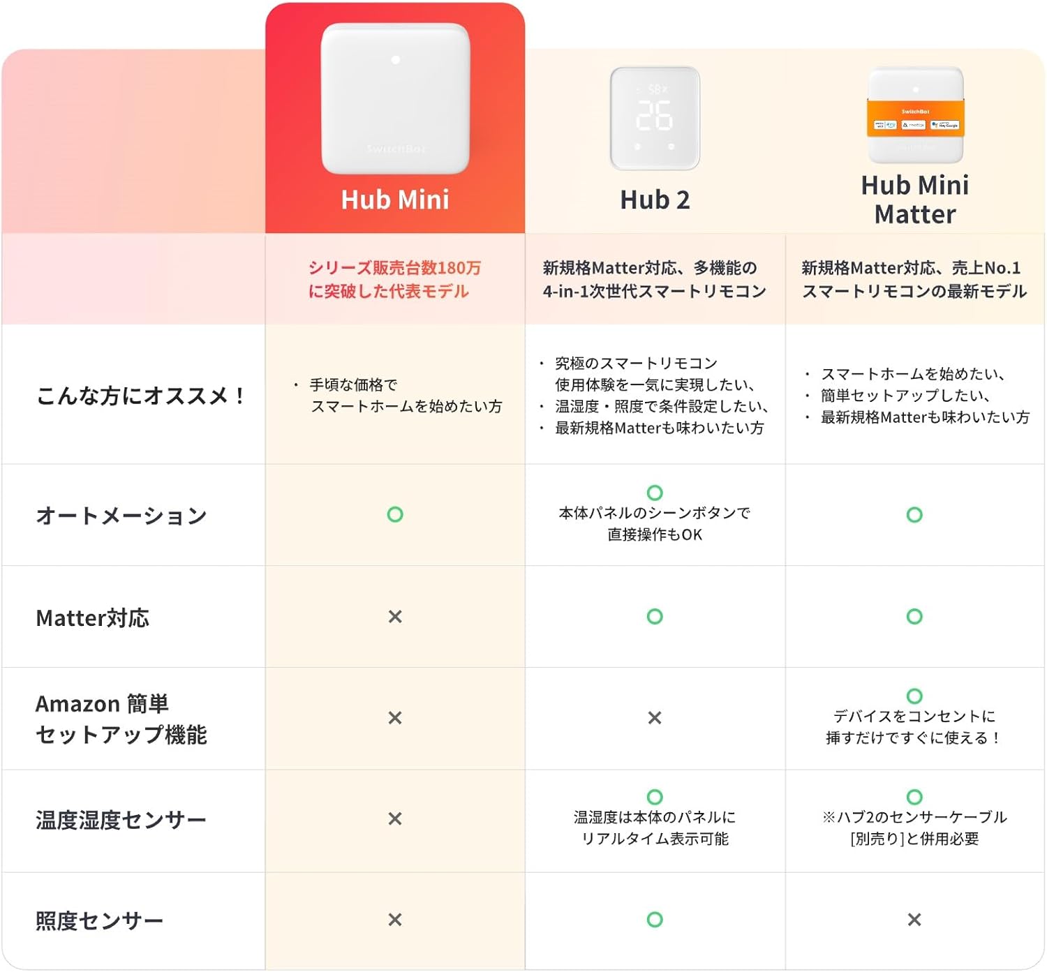 【SwitchBotシリーズ連携】ゲートウェイとして他のSwitchBot製品と連携し、自動化が可能。例:「温度が10℃以下なら暖房ON」、「人感センサーで照明ON」。