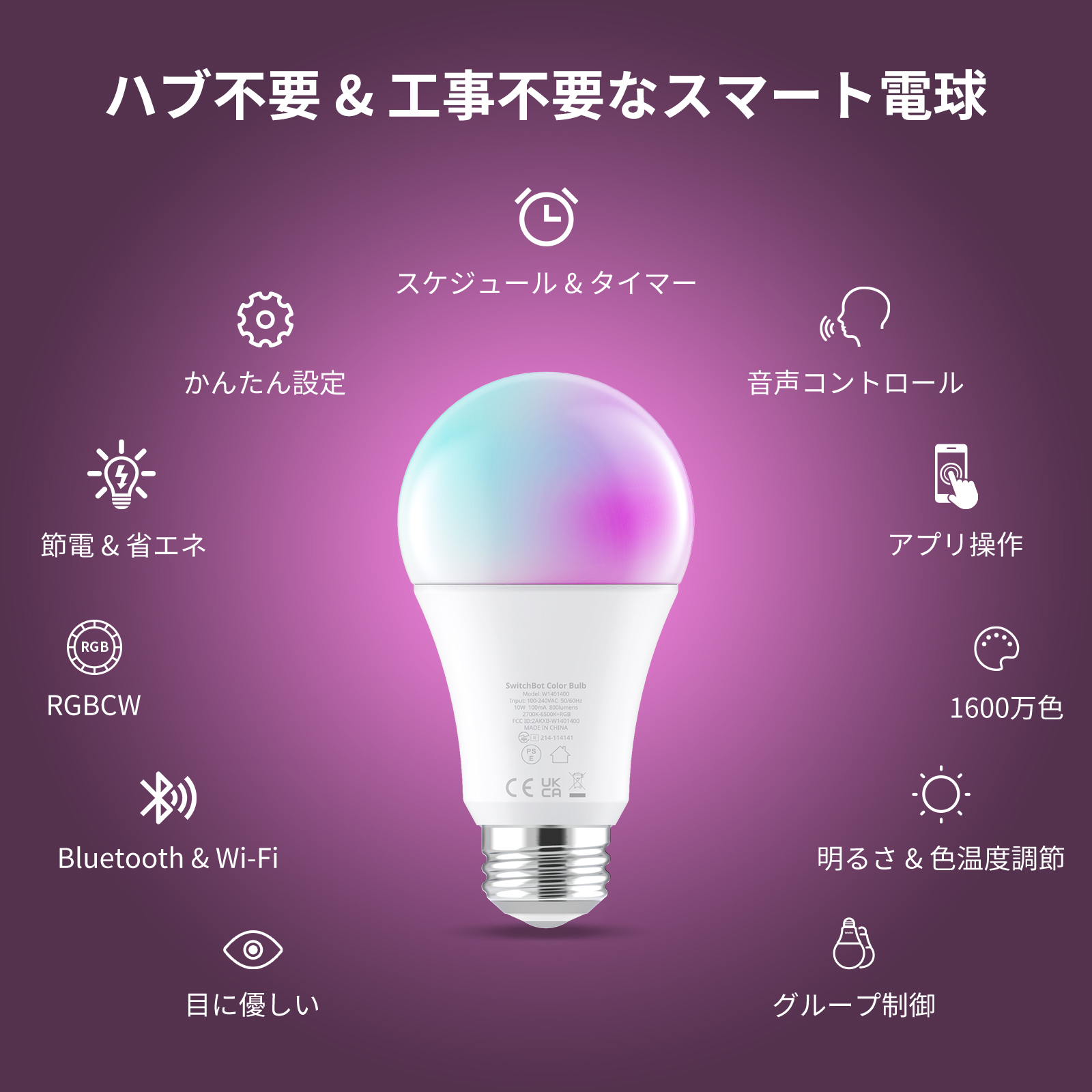 SwitchBot LED電球2個セット スマートライト Alexa スマートホーム スマート電球 E26スイッチボット調光調色 800lm 60W相当 電球色・昼白色 1600万色 1年保証