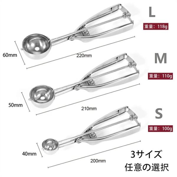 3サイズのアイスクリームスクープ−小さい(ボール直径:1.6インチ/ 4 cm)、中央(ボール直径:2インチ/ 5 cm)と大きな(ボール直径:2.5インチ/ 6.3 cm)