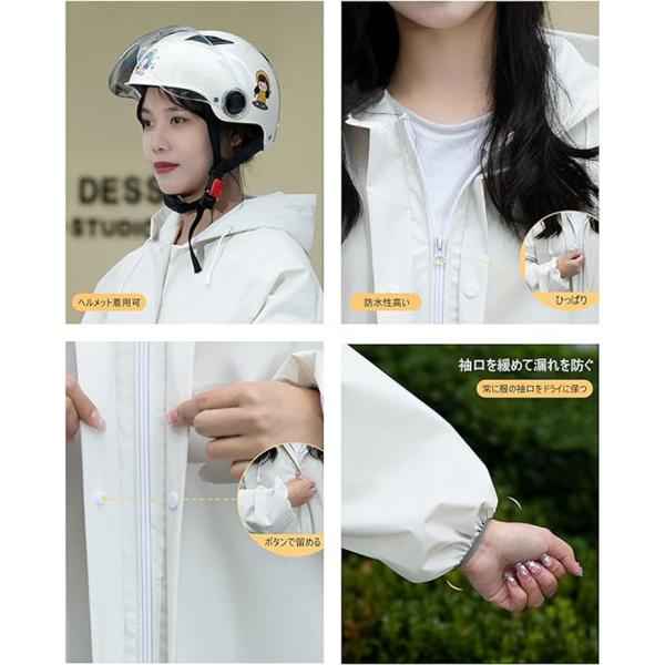 レインコートは二重透明なツバ付きで、視界を遮らないし、紐をギュッと縛ると、顔も濡れず、自転車やバイクの運転も安心です。ゴム袖及び手カバーつきで、袖口からの雨の侵入を防ぎつつ、運転中にも手が濡れない。また、雨具はロング丈なので、足元まで全身をすっぽり覆い、ファスナー+ボタンの二重設計により、雨の侵入を防ぎます。