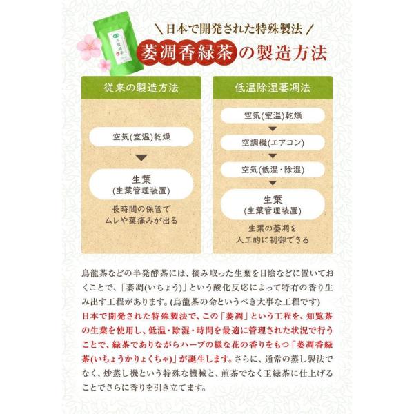 烏龍茶の香りの素となる半発酵の工程を、日本で5年の歳月をかけて開発された特殊製法で、烏龍茶ではなく緑茶のまま花の香りを楽しめるお茶が開発されました。